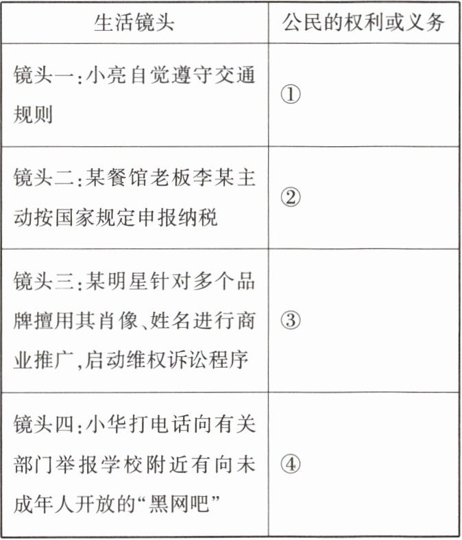(1)请在表格中写出这些生活镜头分别体现了什么权利或义务。
