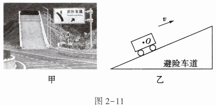 铺有厚厚的碎石,失控车辆一旦冲入就会因陡坡、碎石摩擦而快速停下,这在很大程度上保护了驾乘人员和车辆的安全。正因如此,避险车道被称为高速公路上的“救命道”。请在图 2-11 乙中画出失控车辆冲入避险车道减速滑行时的受力示意图。