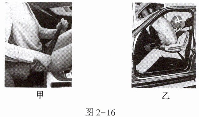 19. 现代汽车的速度很快,一旦发生碰撞,车身停止运动,而乘客身体由于惯性会继续向前运动,在车内与车身撞击,严重时可能把挡风玻璃撞碎而向前飞出车外。为防止撞车时发生类似的伤害,公安部门要求小型客车的驾驶员和乘客必须使用安全带(图 2-16 甲),以便发生交通事故时,安全带对人体起到缓冲的作用,防止出现二次伤害。除了前后排座位都有安全带,很多汽车还安装有安全气囊(图 2-16 乙),一旦发生严重撞击,气囊会自动充气弹出,避免人撞到车身上。