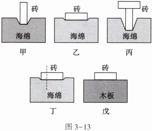 15. 如图3-13所示,小明利用海绵、砖、木板等探究影响压力作用效果的因素。