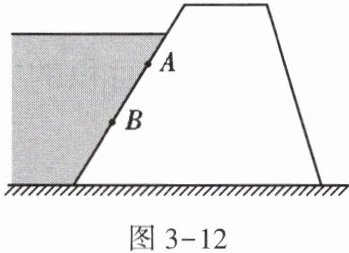 14. 拦河大坝有调水、防洪、发电等功能,大坝设计成上窄下宽的形状,如图3-12所示,请画出水对大坝侧壁面积相同的A、B两处的压力。