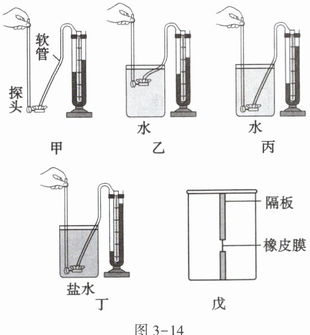 16. 物理课上,同学们利用压强计“研究液体内部的压强”,进行了如图3-14所示的操作。