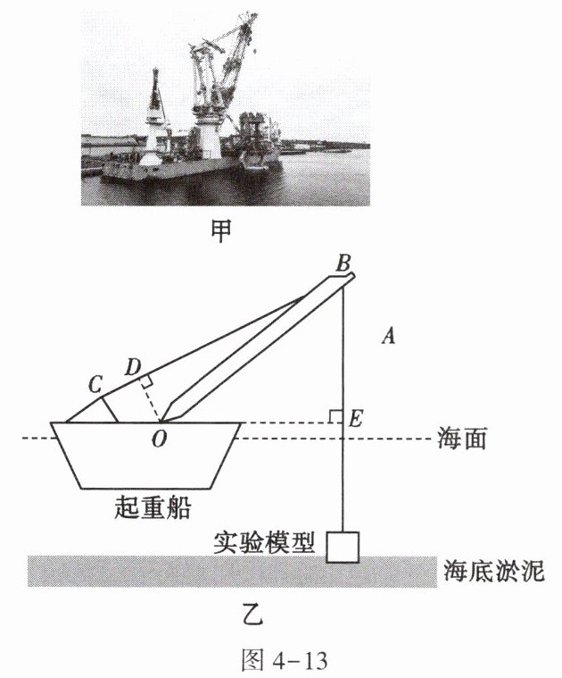 17. 浮式起重机又称起重船,它可以利用船体提供的浮力和船上的起重系统来完成起吊作业。如图4-13甲是某起重船,图4-13乙是它的简化示意图。OB是起重臂,向上提升重物时,起重臂OB保持静止,通过固定在B点的绞车(图中未画出)回收钢缆,将重物吊起。(不计起重臂、绞车和钢缆的重力,不计摩擦,$\rho_{海水}= 1.0×10^{3}kg/m^{3}$,g取10N/kg)