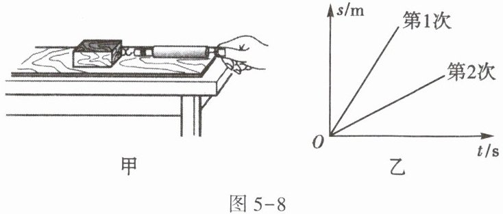 10. 如图 5 - 8 甲所示,小明用弹簧测力计拉着木块,使它沿水平木板匀速滑动,图 5 - 8 乙是他两次拉动同一木块得到的距离随时间变化的图像。当木块两次运动的距离相同时,下列说法正确的是()