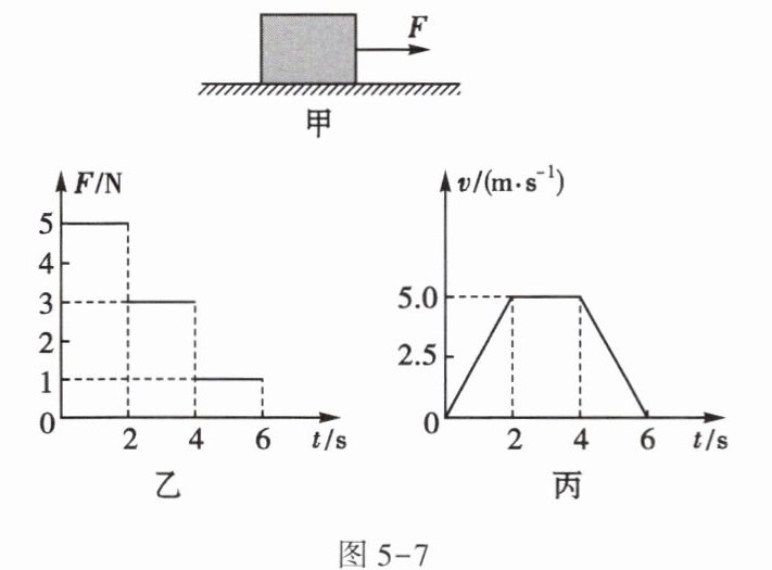 9. 如图 5 - 7 甲所示,物体在水平拉力 F 的作用下由静止沿粗糙水平面向右运动,0~6 s,拉力随时间变化关系如图 5 - 7 乙所示,速度随时间变化关系如图 5 - 7 丙所示,则 2~4 s,物体克服摩擦力做功的功率为()