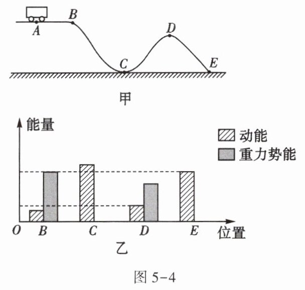 6. 图 5 - 4 甲中过山车从 A 点出发,先后经过 B、C、D、E 点。图 5 - 4 乙是过山车在 B、C、D、E 点的动能和重力势能大小的关系示意图,则过山车的动能在______(填“B”“C”“D”或“E”)点最大,B 点的重力势能的大小______(填“大于”“小于”或“等于”)E 点的动能的大小。在这个过程中,过山车的机械能是______(填“增大”“减小”或“不变”)的。