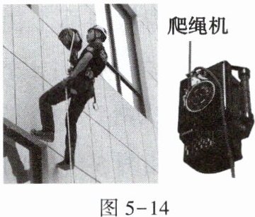 16. 如图 5 - 14 是一款爬绳机,这款爬绳机可以不消耗人的体能,轻松攀爬、下降,可用于消防救援、矿井救援及桥梁检测维修等。在某次爬升过程中,将一个重 700 N 的工人,以 0.2 m/s 的速度匀速竖直提升 12 m。