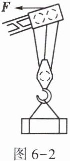 2. 如图6-2,塔式起重机上的滑轮组将重为$1.2×10^{4}N$的重物匀速吊起2m,用了5s,滑轮组的机械效率为80%。提升重物做的有用功为____J,拉力的功率为____W。若克服摩擦和钢丝绳重所做的功为$5.2×10^{3}J$,则动滑轮的质量为____kg。(g取10N/kg)