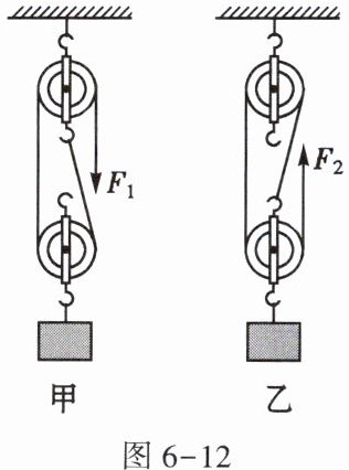 12. 如图6-12所示,甲、乙分别为同一滑轮组的不同绕法,忽略绳重及摩擦,分别用两种绕法匀速提升相同的重物,在相等时间内升高相同的高度。下列判断正确的是()