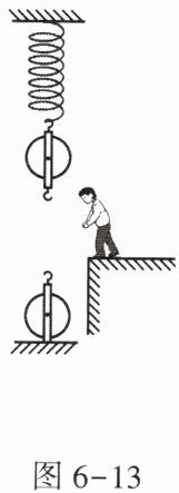 13. 一个质量为50kg的人站在水平面上,他想通过如图6-13所示的滑轮组对上面的弹簧进行拉力测试,需要对弹簧产生最大2100N的力,请画出他的绕绳方法。(动滑轮重力不计)
