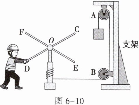 10. 如图6-10所示,推动硬棒CD(或EF),使它们在水平面内绕点O转动,即可将绳逐渐绕到轴上,以提升重物。小明用此装置将重为400N的重物匀速提升0.6m,此过程中装置的机械效率为80%。下列说法正确的是()