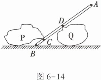 14. 如图6-14所示,用一根自重可忽略不计的撬棒撬石块,若撬棒C点受到石块P的压力,且CD>BC,请作出撬动石块P所用的最小动力F及其力臂l。