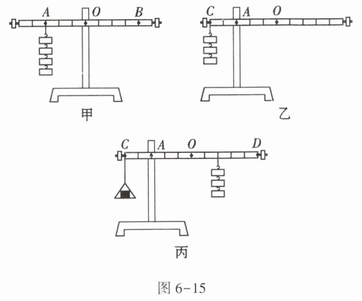 ②然后小明将C位置的3个钩码取下,挂到右侧作为“秤砣”,如图6-15丙所示。为了将A点作为“杆秤”的零刻度线,小明应在图6-15丙C位置处装配一质量为____g的吊盘。