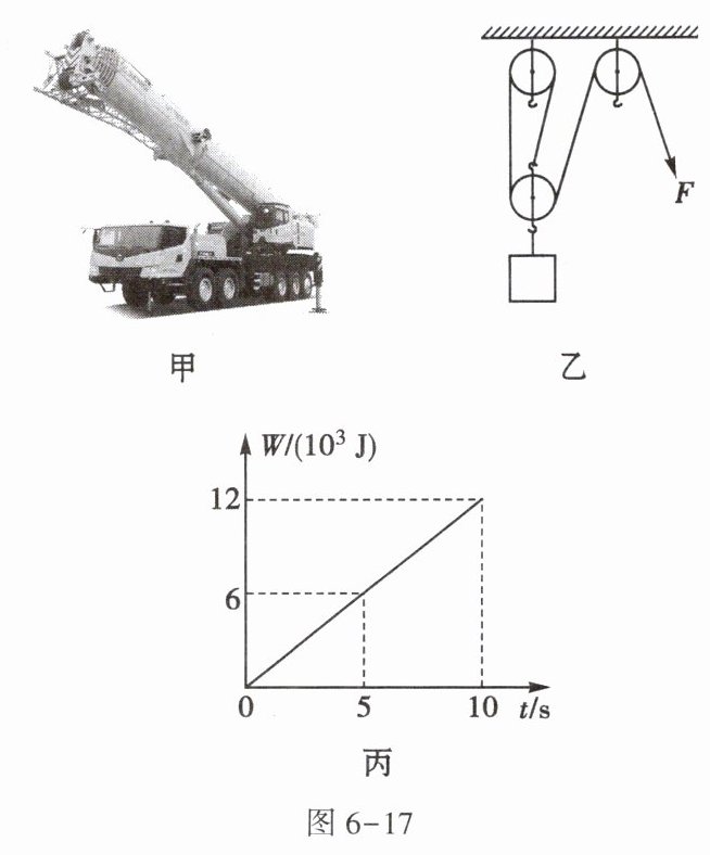 17. 修建房屋时,人们往往会利用起重机(如图6-17甲所示)来搬运质量较大的建筑材料,图6-17乙为起重机内部滑轮组的简易图。现用该起重机将质量为200kg的建筑材料以0.5m/s的速度向上拉起5m,绳子自由端的拉力F所做的功与时间的关系如图6-17丙所示,不计绳重和摩擦,g取10N/kg。求: