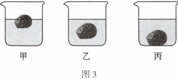 5. 小明把盛有热水的烧杯放在水平桌面上,将干红枣放入烧杯中,红枣漂浮在水面,如图3甲所示;由于不断吸水,红枣过一段时间后静止在水中,如图3乙所示;再过一段时间后就沉到杯底,如图3丙所示。图3甲中红枣的重力______排开热水的重力,图3甲中烧杯对桌面的压强______图3丙中烧杯对桌面的压强,图3甲中液面高度______图3乙中液面高度。(不考虑蒸发的影响,填“大于”“等于”或“小于”)