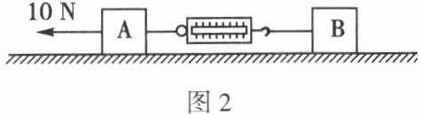 3. 如图2所示,弹簧测力计连接在两个相同木块之间,用水平向左10N的力使整体一起在水平桌面做匀速直线运动,此时弹簧测力计的示数______(填“大于”“等于”或“小于”)10N,木块A所受的摩擦力为______N。