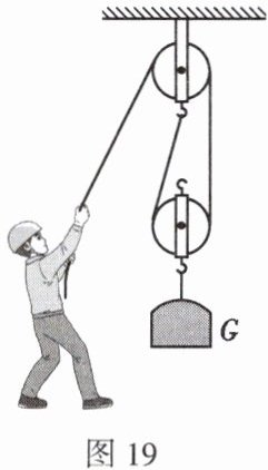 21. 重力为500N的工人用如图19所示的滑轮组提升重物,工人站在地面上向下拉动绳子,使重400N的物体G在10s内匀速上升1m。已知每个滑轮的重力均为100N,不计绳重和摩擦。