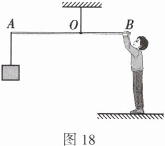 20. 如图18所示是小宁同学利用健身器材进行锻炼的示意图,其中横杆AB可绕固定点O在竖直平面内转动,OA长1m,OB长0.6m,在杆的A端用绳子悬挂质量为15kg的配重,他在B端施加竖直向下的拉力$F_1$时,杆AB在水平位置平衡。已知小宁重为450N,两只脚与地面接触的总面积为$0.04m^2,$不计杆重与绳重,g取10N/kg。求此时: