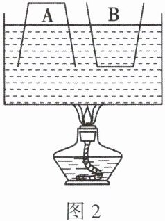 4. 两个完全相同的玻璃杯A和B,A倒扣着放入盛水的容器中,B中装有一些水,如图2所示放置。用酒精灯给容器中的水加热,在水沸腾后继续加热的过程中,A杯中的水____沸腾,B杯中的水____沸腾。(填“能”或“不能”)