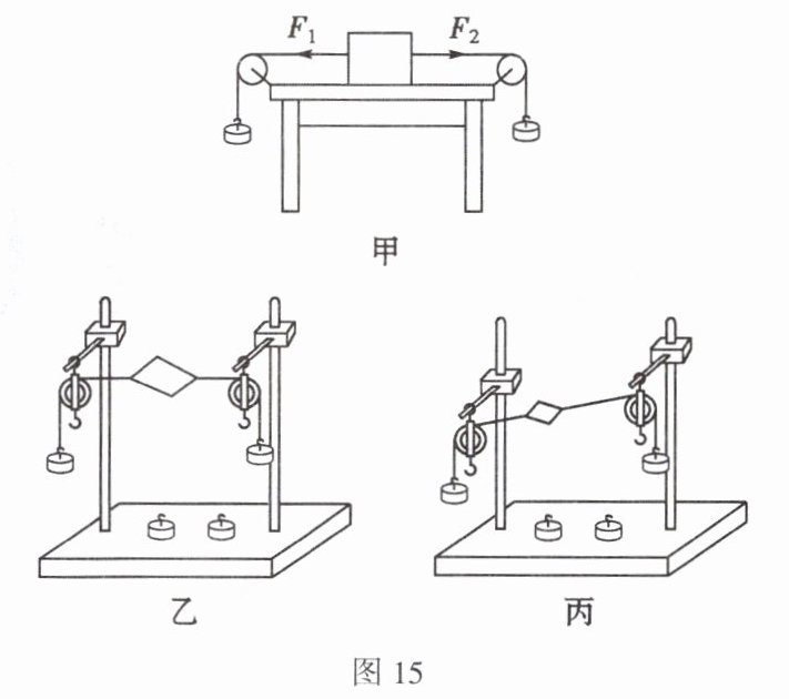 (4) 小红设计了如图15乙所示的装置探究,同学们认为小红的实验优于小明的实验,其主要原因是____。用剪刀从小卡片的中间将小卡片剪开,可以探究相互平衡的两个力需要满足的条件是____。如果两个滑轮安装成不同的高度,如图15丙所示,该装置____(填“能”或“不能”)探究二力平衡的条件。