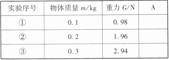 (2) 表中第一行A处缺少的栏目是____;分析表中数据,可以得到的结论是:物体的重力与质量成____。