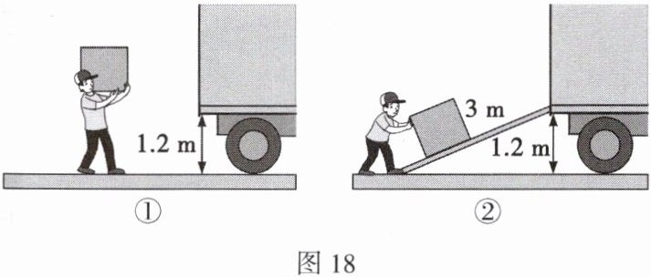 21. 如图18所示,利用斜面将箱子推进车厢,通常要比把箱子直接从地面搬进车厢省力得多。某工人用沿斜面向上的推力将重800N的货物从地面匀速推进车厢,已知斜面长3m、高1.2m,在这个过程中,工人所做的额外功为240J。