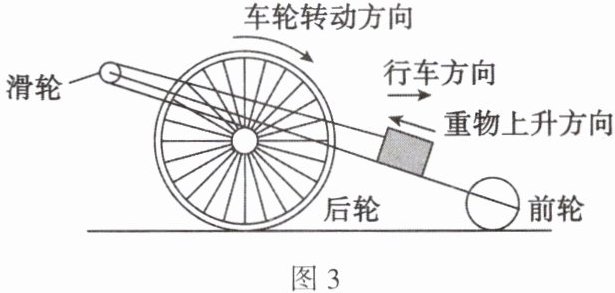 4. 如图3所示为《墨经》记载的一种斜面引重车。绳子一端紧系在后轮,另一端绕过斜面顶端的滑轮与重物相连。轻推后轮,重物通过绳子被逐渐提升至斜面顶端。若物重为4000N,斜面长2m、高0.8m,后轮施加在绳子上的力为2000N(不计绳重、滑轮与绳间的摩擦),该斜面的机械效率为____,重物与斜面之间的摩擦力为____N。