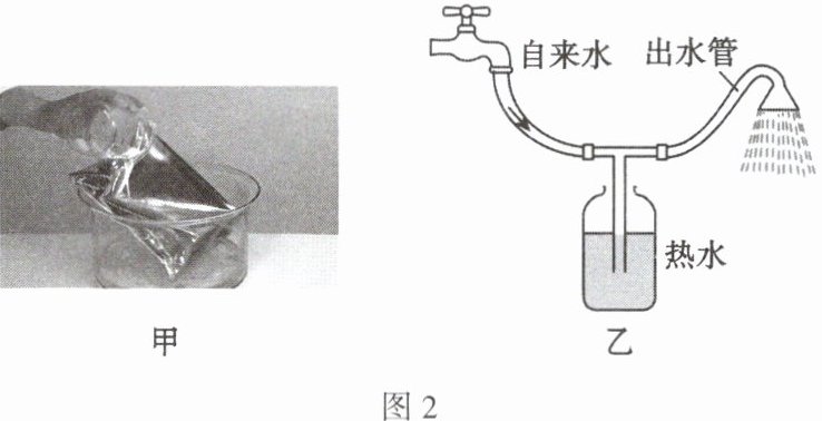 3. 铁桶内放少量的水,用火加热,水沸腾之后把桶口堵住,然后浇上冷水,如图2甲所示,在____的作用下,铁桶被压瘪了。让自来水流过如图2乙所示的装置,当水流稳定后,最后喷出的是____(填“冷水”“热水”或“温水”),这是利用了____。