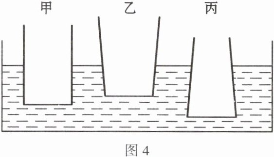 们的底端(底面积相同)挡一薄塑料片后都竖直放入水中,如图4所示。当分别注入100g水时薄塑料片都恰好下落;如果不注水,而是分别轻轻放一个100g的钩码,则甲的薄塑料片____下落,乙的薄塑料片____下落,丙的薄塑料片____下落。(填“一定”“一定不”或“不一定”)