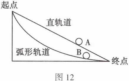 14. (双选)如图12所示是“最速降线”简化结构示意图,现将A、B两个完全相同的球分别从直轨道和弧形轨道的起点同时由静止释放,两球速度越来越快,结果弧形轨道上的B球先到达终点。忽略摩擦力的影响,下列说法正确的是()