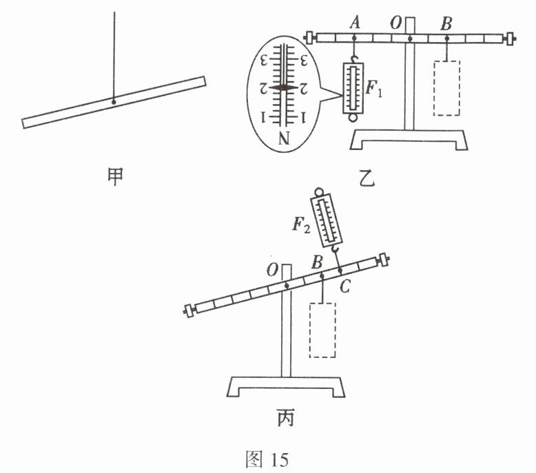 (3) 小明将弹簧测力计重新调零后,挂在C点,用弹簧测力计将杠杆拉至如图15丙所示的位置平衡,弹簧测力计与杠杆垂直,此时弹簧测力计示数为$F_{2}$,则$F_{2}$____(填“>”“<”或“=”) $F_{1}$。