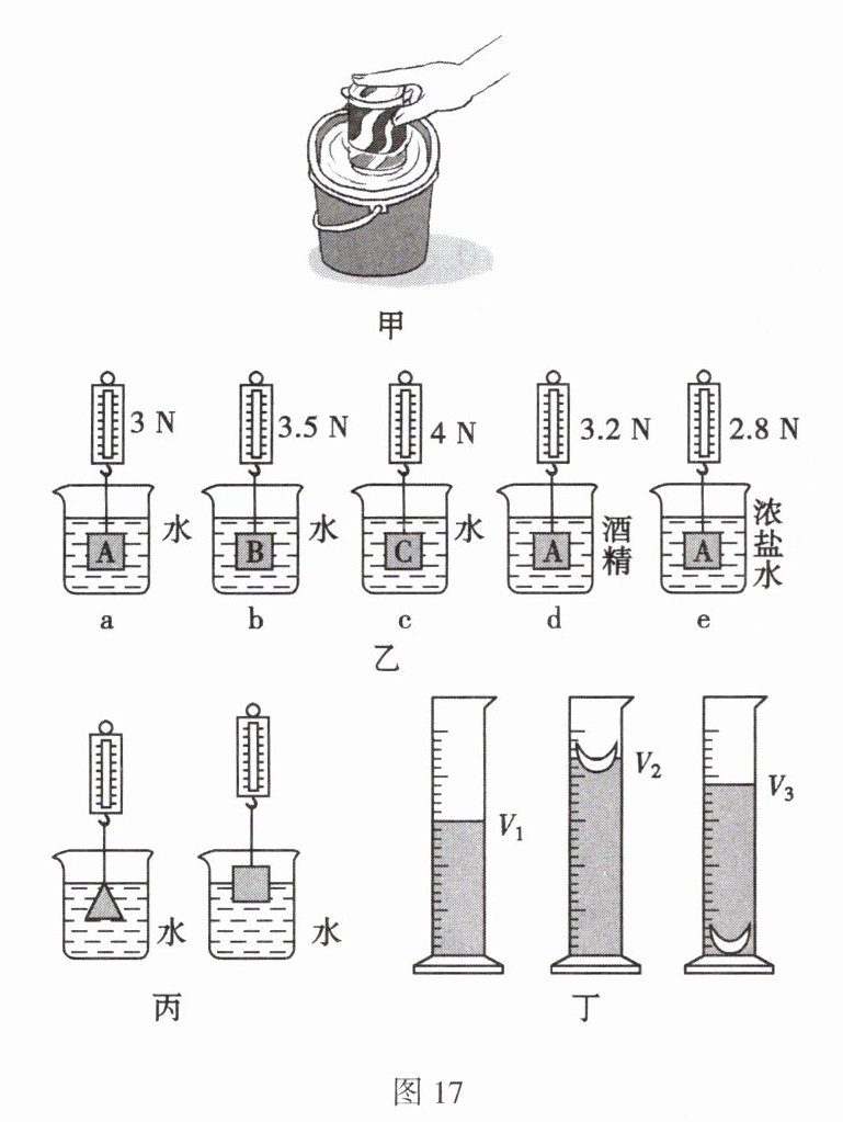 (3) 为了研究猜想Ⅲ,将两块相同的橡皮泥(不吸水且不溶于水)分别做成不同形状,进行如图17丙所示的实验,此时两弹簧测力计的示数不同,于是得出结论:浮力的大小与物体的形状有关。同学小珍认为该结论不可靠,主要原因是____。