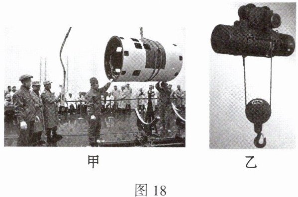 20. 如图18甲所示,工作人员正在组装神舟飞船。用图18乙所示的电动滑轮将重$2×10^{4}N$的飞船部件在10s内匀速提升2m,电动滑轮的输出功率是$5×10^{3}W$。求: