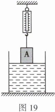 21. 如图19所示,在一个底面积为$150cm^{2}$且足够深的薄壁柱形容器内装入一定量的水,放在一个足够大的桌面中央。将一个高为10cm、底面积为$50cm^{2}$的圆柱形实心塑料块A挂于弹簧测力计上,弹簧测力计上端固定。当塑料块A的底面刚好接触水面时,弹簧测力计(0刻度线与1N刻度线之间的间隔为1cm)示数为4N,向容器里缓慢加水。($\rho_{水}= 1.0×10^{3}kg/m^{3}$,g取10N/kg)