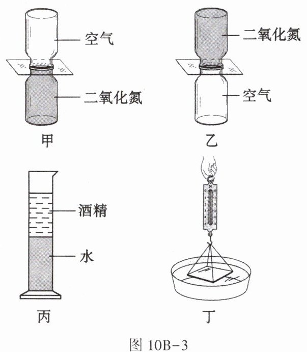 【分析】(1)图甲中,二氧化氮的密度大于空气密度,它运动到上面的瓶子内,说明气体分子在不停地做无规则运动;图乙中,密度大的二氧化氮气体在上方,抽去玻璃板后,由于重力的作用,二氧化氮气体会向下运动,所以不能完全说明气体分子在不停地做无规则运动。故更合理的是图甲。(2)分子在不停地做无规则的运动,说明分子间存在间隙,所以酒精和水混合后的总体积小于酒精和水的体积之和。(3)玻璃和水接触在一起,由于分子间存在引力,故向上拉玻璃板时,弹簧测力计的示数大于玻璃所受到的重力。