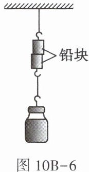 6. 如图 10B - 6 所示,将两个底面干净、平整的铅块紧压在一起,两个铅块就会结合在一起,下面吊一个较重的物体也不会将它们拉开。此现象说明