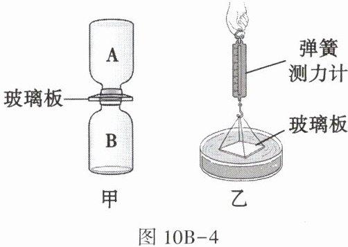 2. 用如图 10B - 4 甲所示装置演示气体扩散现象,其中一瓶装有密度比空气密度大的二氧化氮气体,另一瓶装有空气,为了让实验结论更可靠,装二氧化氮气体的应是____(填“A”或“B”)瓶;如图 10B - 4 乙所示,用弹簧测力计提起贴在水面的玻璃板时,弹簧测力计的示数变大,说明分子间存
