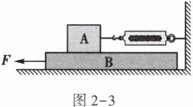 5. 芳芳用如图 2-3 所示的装置进行实验探究(不计弹簧测力计的重力):当水平向左的拉力 $ F = 10 \, \text{N} $ 时,物体 B 水平向左匀速运动(B 足够长),弹簧测力计示数为 4 N 且保持不变,此时物体 A 受到的摩擦力大小为______N,物体 B 对地面的摩擦力大小为______N。