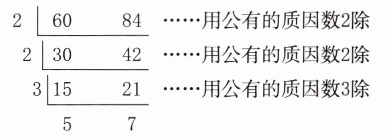 $\begin{array}{r} 2|\underline {60\quad 84}\\ 2|\underline {30\quad 42}\\ 3|\underline {15\quad 21}\\ \quad \quad 5\quad 7\end{array} $