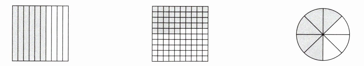 1. 分别用小数和分数表示下面各图中涂色部分的大小。