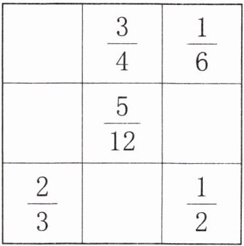 第一行第一个数$\frac{2}{3}$;第二行第三个数$\frac{3}{4}$;第三行中间数$\frac{5}{12}$;第二列第三个数$\frac{5}{12}$;第一列第三个数$\frac{5}{12}$。(按方格从左到右,从上到下,空格依次为$\frac{2}{3}$,$\frac{3}{4}$,$\frac{5}{12}$)。