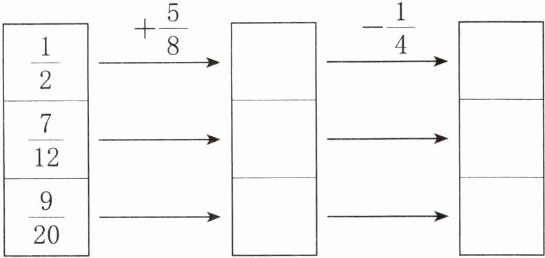 - 对于$\frac{1}{2}+\frac{5}{8}$:先通分,$2$和$8$的最小公倍数是$8$,$\frac{1}{2}=\frac{1×4}{2×4}=\frac{4}{8}$,则$\frac{1}{2}+\frac{5}{8}=\frac{4}{8}+\frac{5}{8}=\frac{9}{8}$;再计算$\frac{9}{8}-\frac{1}{4}$,$4$和$8$的最小公倍数是$8$,$\frac{1}{4}=\frac{1×2}{4×2}=\frac{2}{8}$,所以$\frac{9}{8}-\frac{1}{4}=\frac{9}{8}-\frac{2}{8}=\frac{7}{8}$。