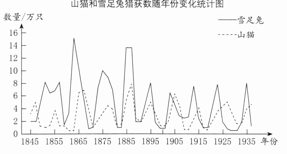 5. 下图是加拿大某公司绘制的他们在将近100年的时间内猎获的山猫和雪足兔的数量,山猫是靠吃雪足兔为生的。由这个图,人们惊奇地发现山猫和雪足兔的数量竟然会有很奇妙的变化规律。你发现了吗?