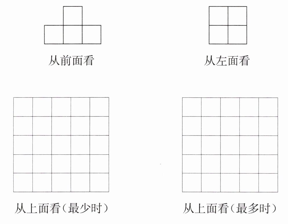 5. 聪聪小朋友很伤心,原来是因为小狗碰倒了他刚刚用小正方体积木搭好的几何体。已知这个几何体从前面和左面看到的图形如下,求该几何体最少是由多少个小正方体积木搭成的,最多是由多少个小正方体积木搭成的,并分别画出此时从上面看到的图形。