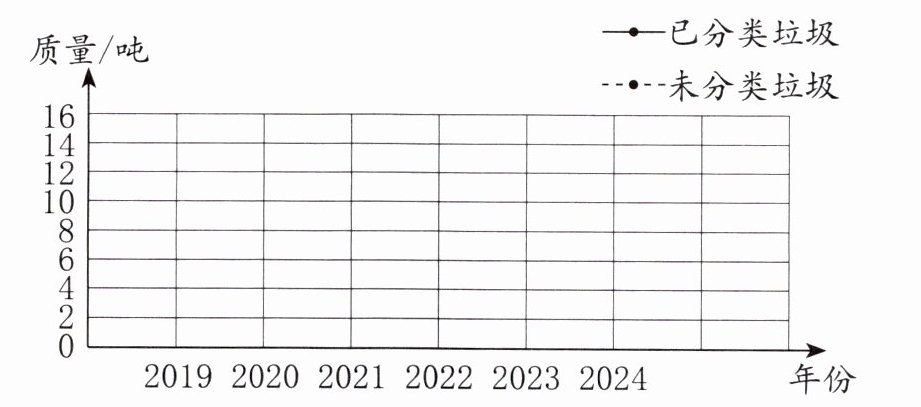 3. 垃圾分类可以提高垃圾的资源价值和经济价值,减少垃圾处理量和处理设备的使用,降低处理成本,减少土地资源的浪费,在社会、经济、生态等方面均产生显著效益。下面是某小区2019—2024年生活垃圾中已分类垃圾与未分类垃圾质量情况统计表。根据统计表画出折线统计图,并回答问题。