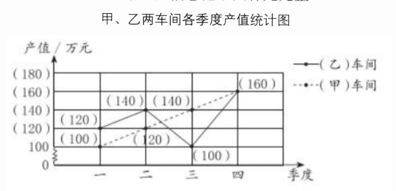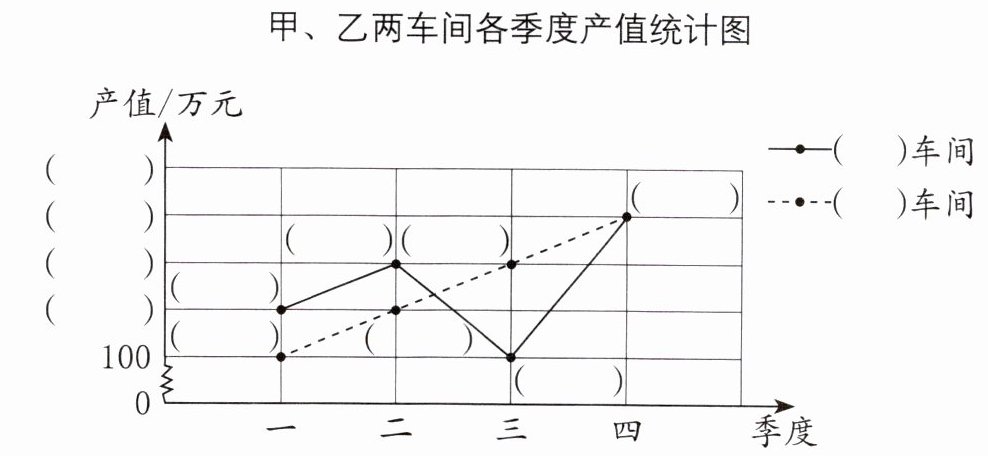 4. 下面是去年某厂甲、乙两车间各季度产值统计图。已知两车间产值相差最大的那一季度甲车间比乙车间多40万元,根据已知信息把下图补充完整。