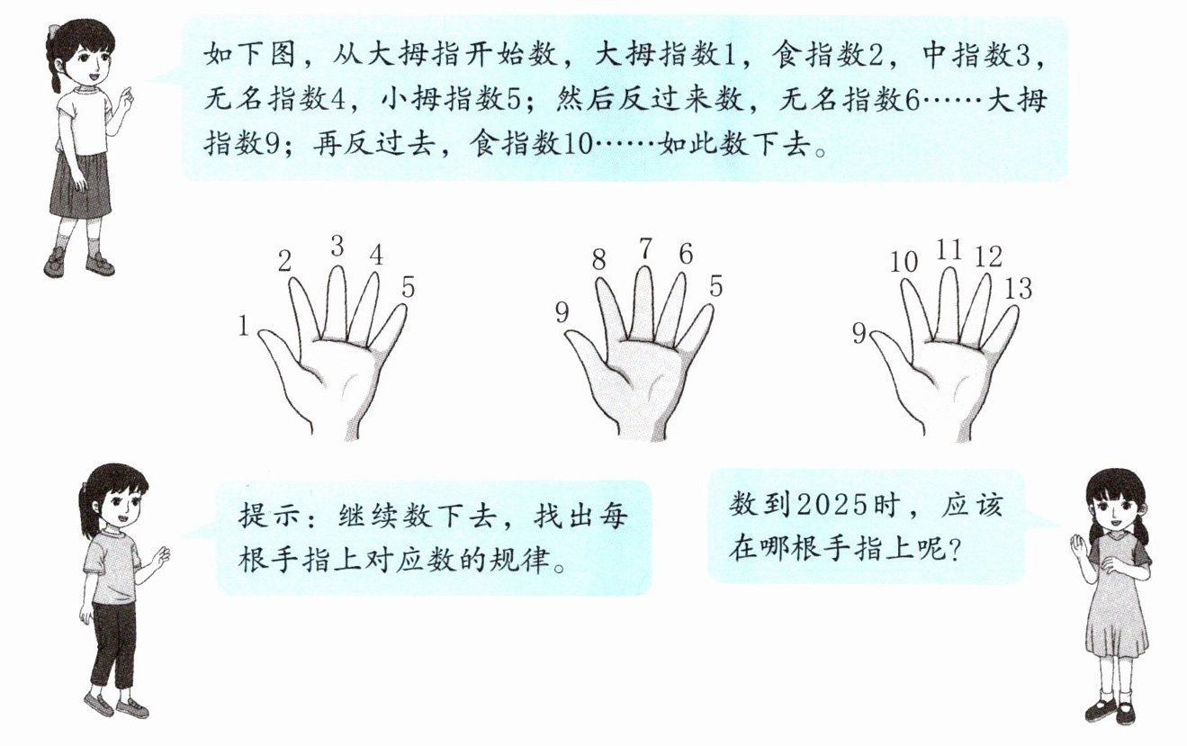 从大拇指开始数,除去大拇指第一次数的$1$,后面每$8$个数为一组循环,循环节涉及的手指顺序为:食指、中指、无名指、小指、无名指、中指、食指、大拇指。