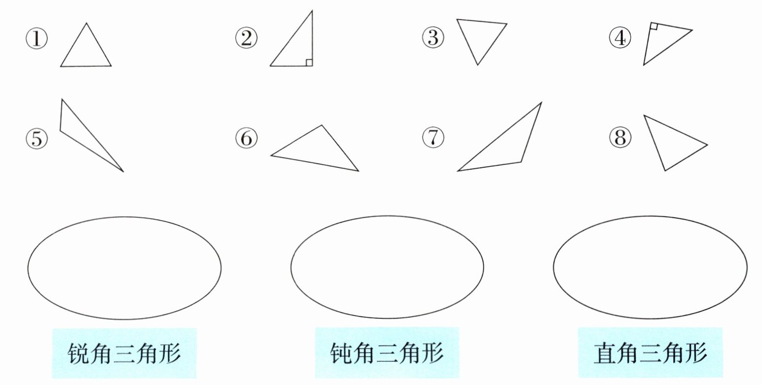 锐角三角形:①③⑧ 钝角三角形:⑤⑥⑦ 直角三角形:②④