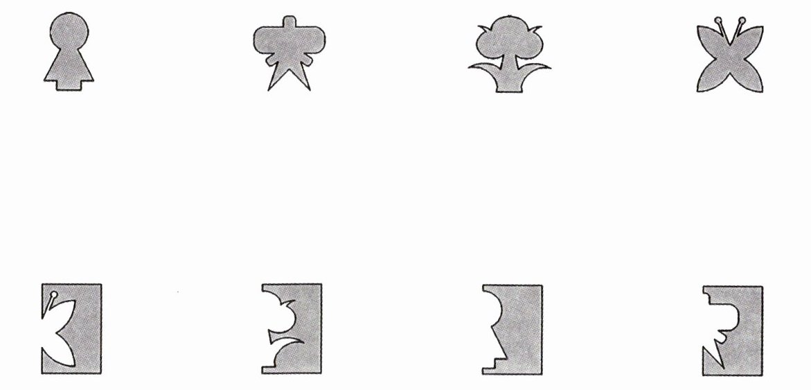 【解析】:通过观察图案的形状特征,将上面的图案与下面对应的剪纸形状进行匹配。第一个图案是类似小人形状,与下面第三个剪纸形状匹配;第二个图案类似风筝形状,与下面第四个剪纸形状匹配;第三个图案类似花朵形状,与下面第二个剪纸形状匹配;第四个图案类似蝴蝶形状,与下面第一个剪纸形状匹配。