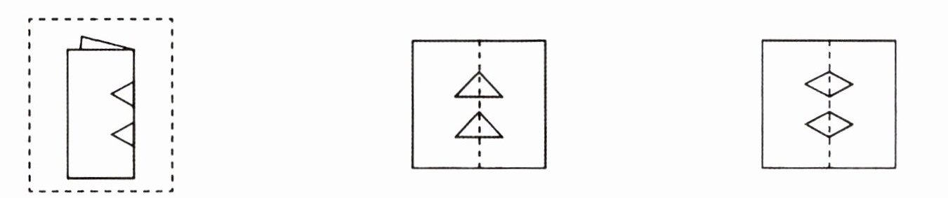 4. 如下面左图,小明在对折好的纸上剪了两个洞,打开后会是什么图形?在对应的图形下面画“√”。